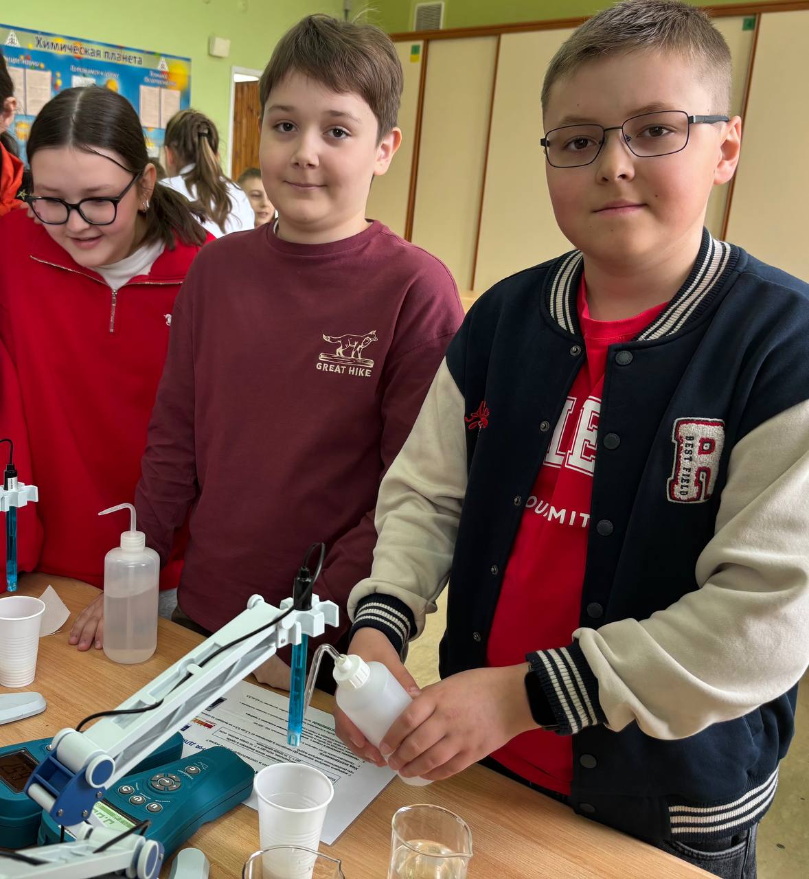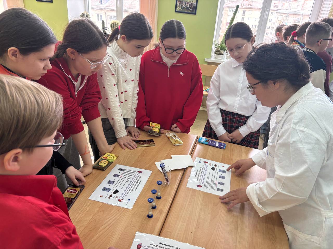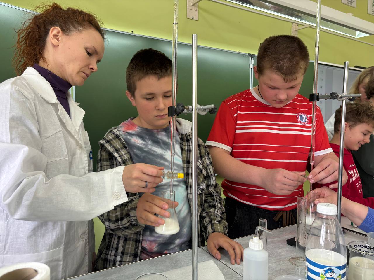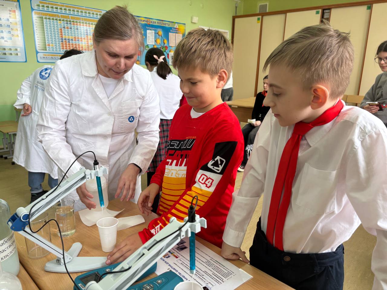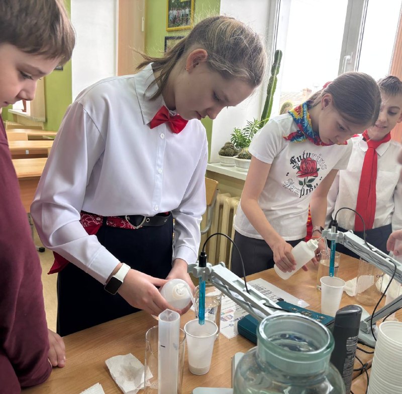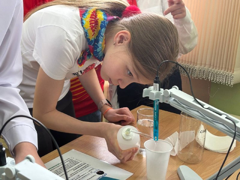 Шефы провели практикум «Введение в профессию химика-аналитика». На этом уроке пятиклассники не только познакомились с основами профессии, но и приняли участие в практических экспериментах, что позволило им наглядно увидеть применение химических знаний на практике. Они проверяли качество шоколада, кислотность молока и безопасность шампуня.