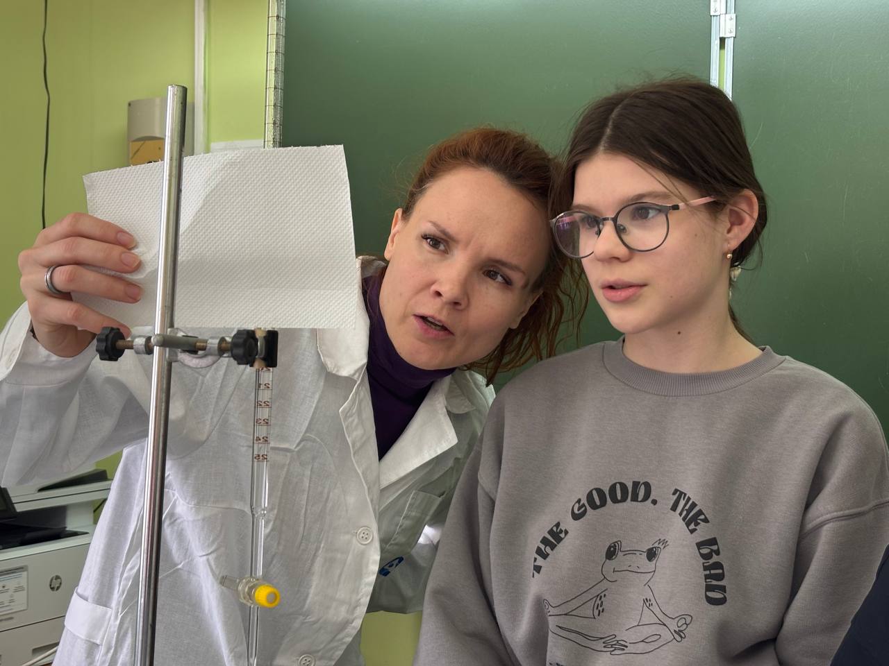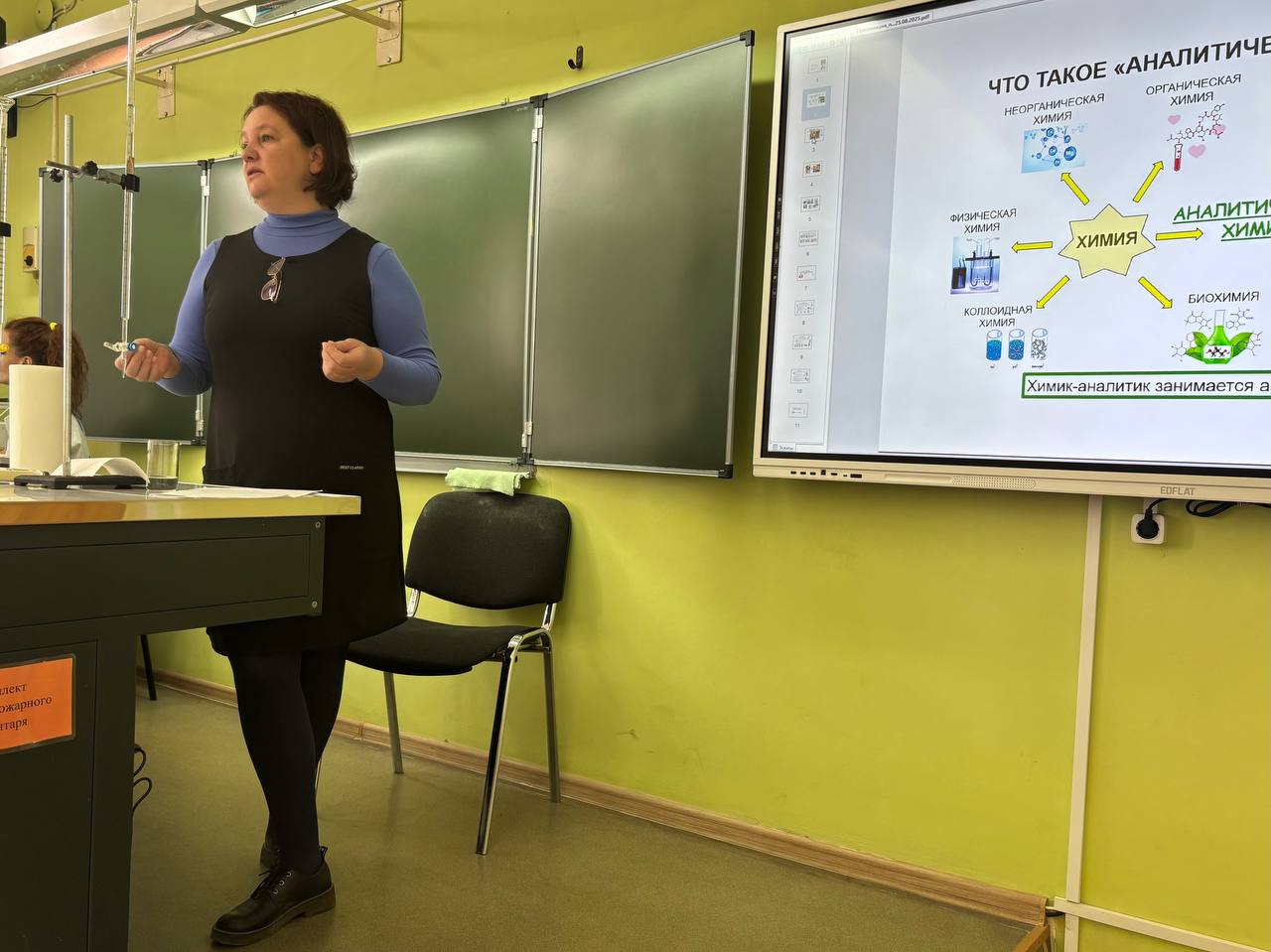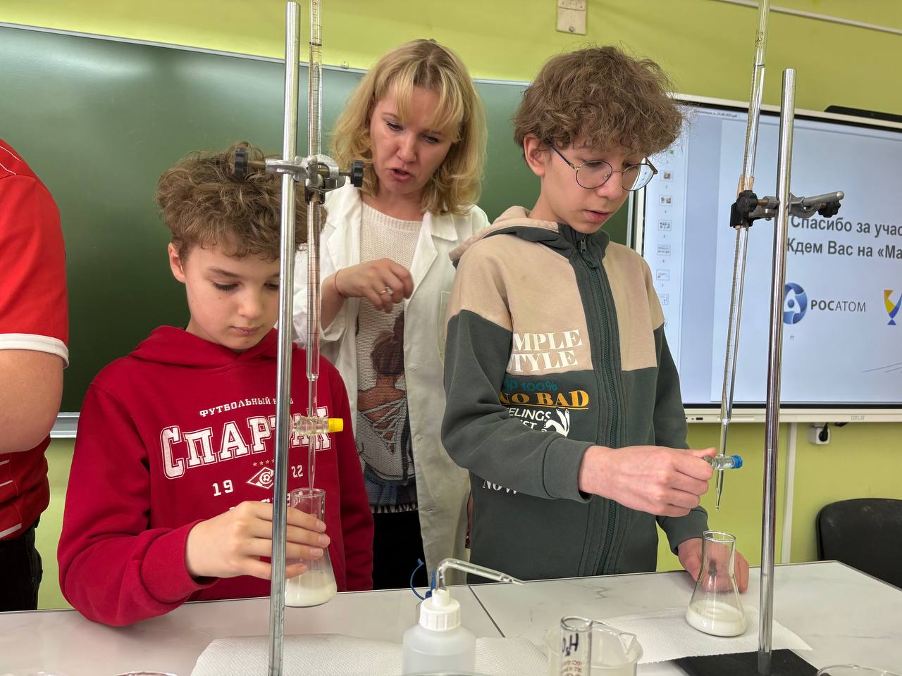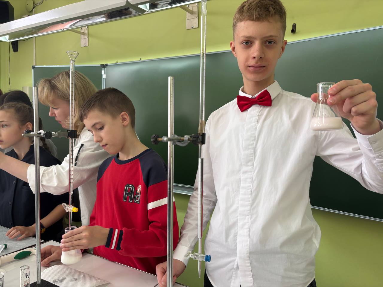 Шефы провели практикум «Введение в профессию химика-аналитика». На этом уроке пятиклассники не только познакомились с основами профессии, но и приняли участие в практических экспериментах, что позволило им наглядно увидеть применение химических знаний на практике. Они проверяли качество шоколада, кислотность молока и безопасность шампуня.
