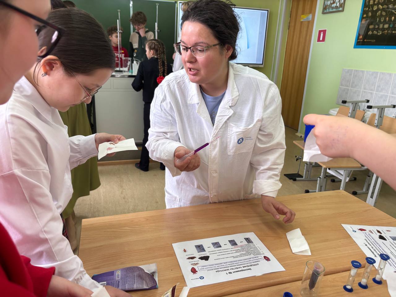 А сегодня мы решили заглянуть в гости к самым юным ученикам, к пятиклассникам. На «Дне проектов» специалисты ЦЗЛ – Ольга Степанова, Татьяна Зайцева, Ольга Диченко и Анна Брайчун – превратили обычный класс в настоящую лабораторию. Вместе мы проверяли качество шоколада, кислотность молока и безопасность шампуня.