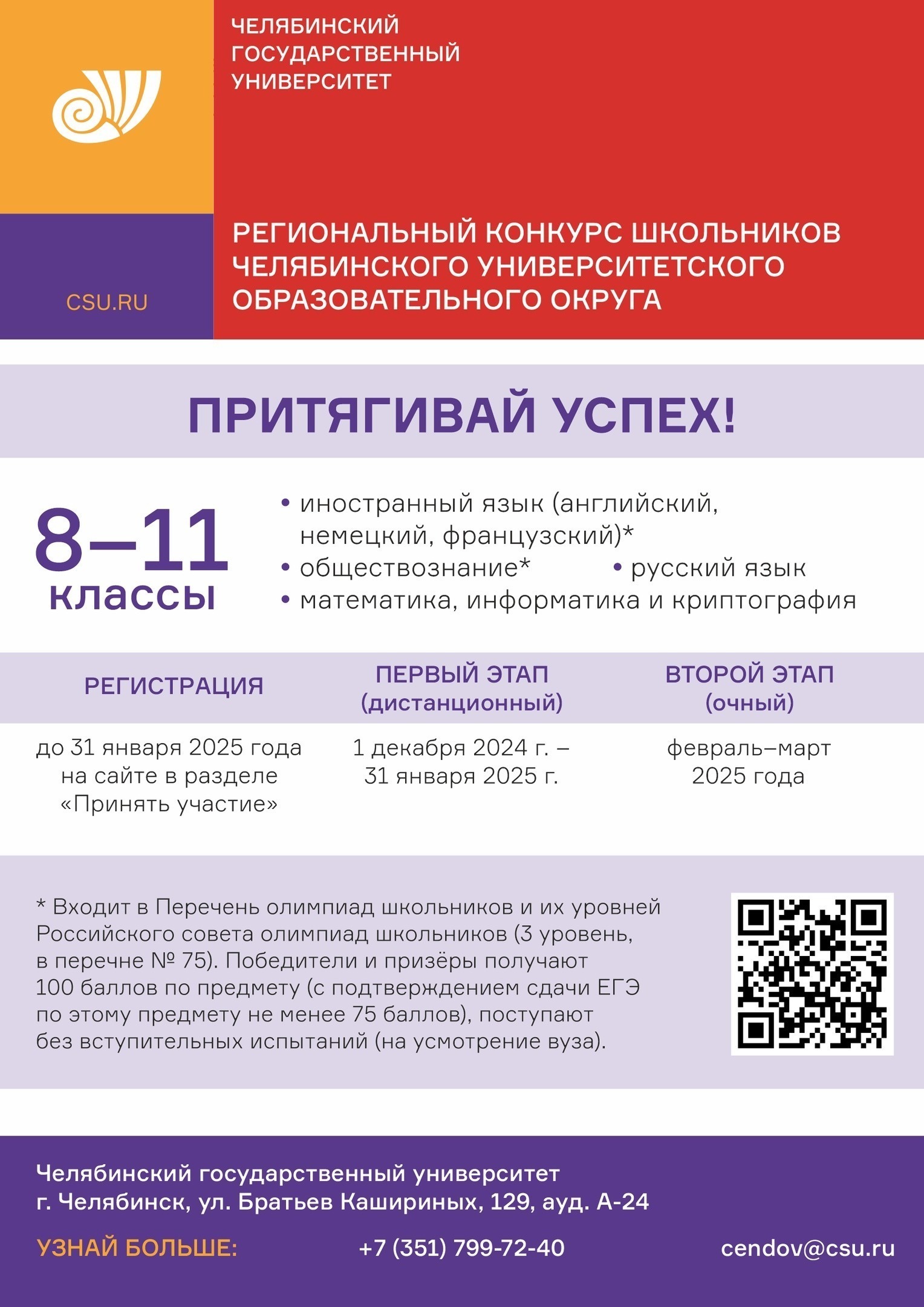 1. Региональный конкурс школьников Челябинского университетского образовательного округа (№630 в перечне олимпиад на 2024-2025 уч.год) проводится для обучающихся 8–11 классов по предметам: иностранный язык (английский, немецкий, французский), обществознание, русский язык, математика, информатика и криптография.