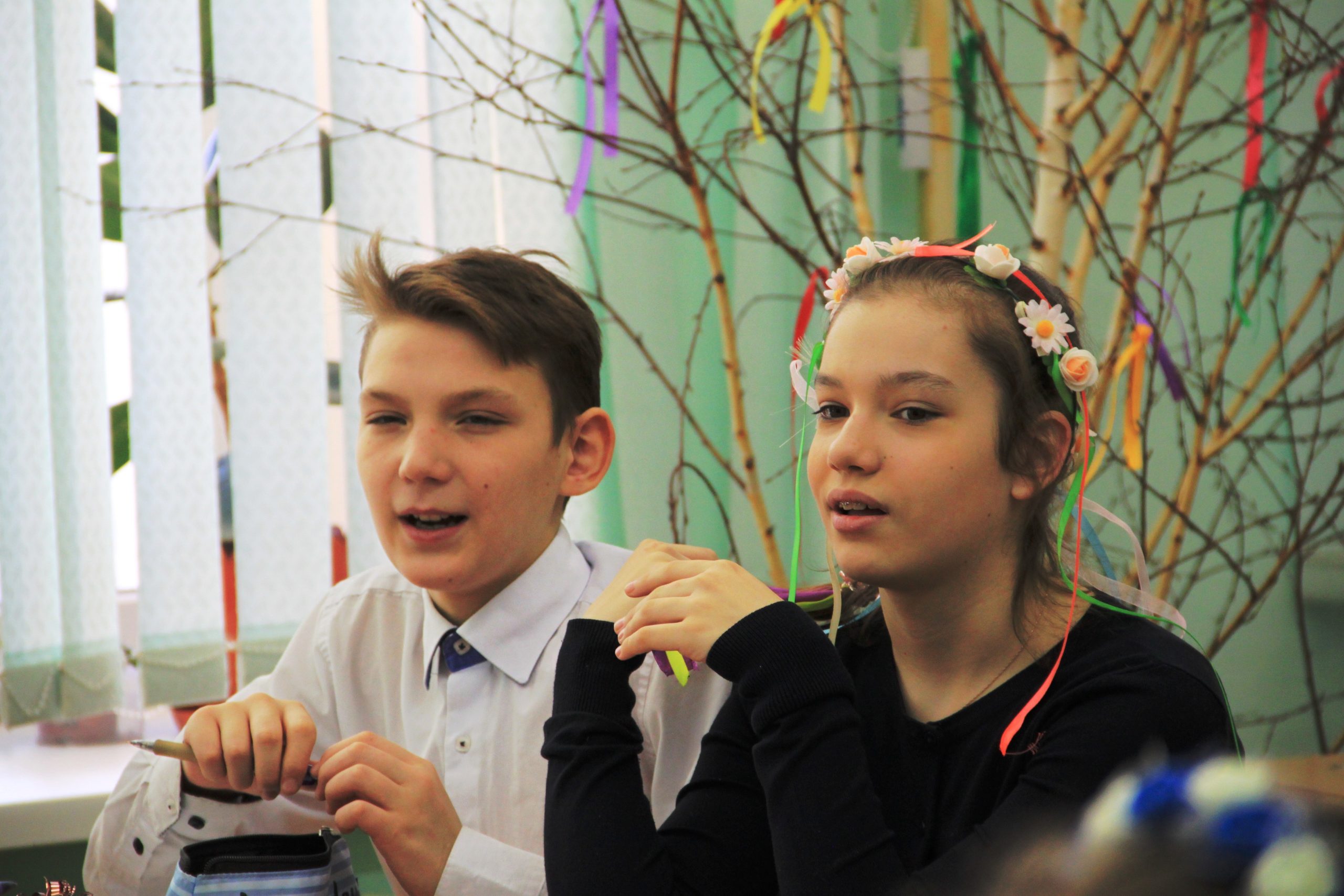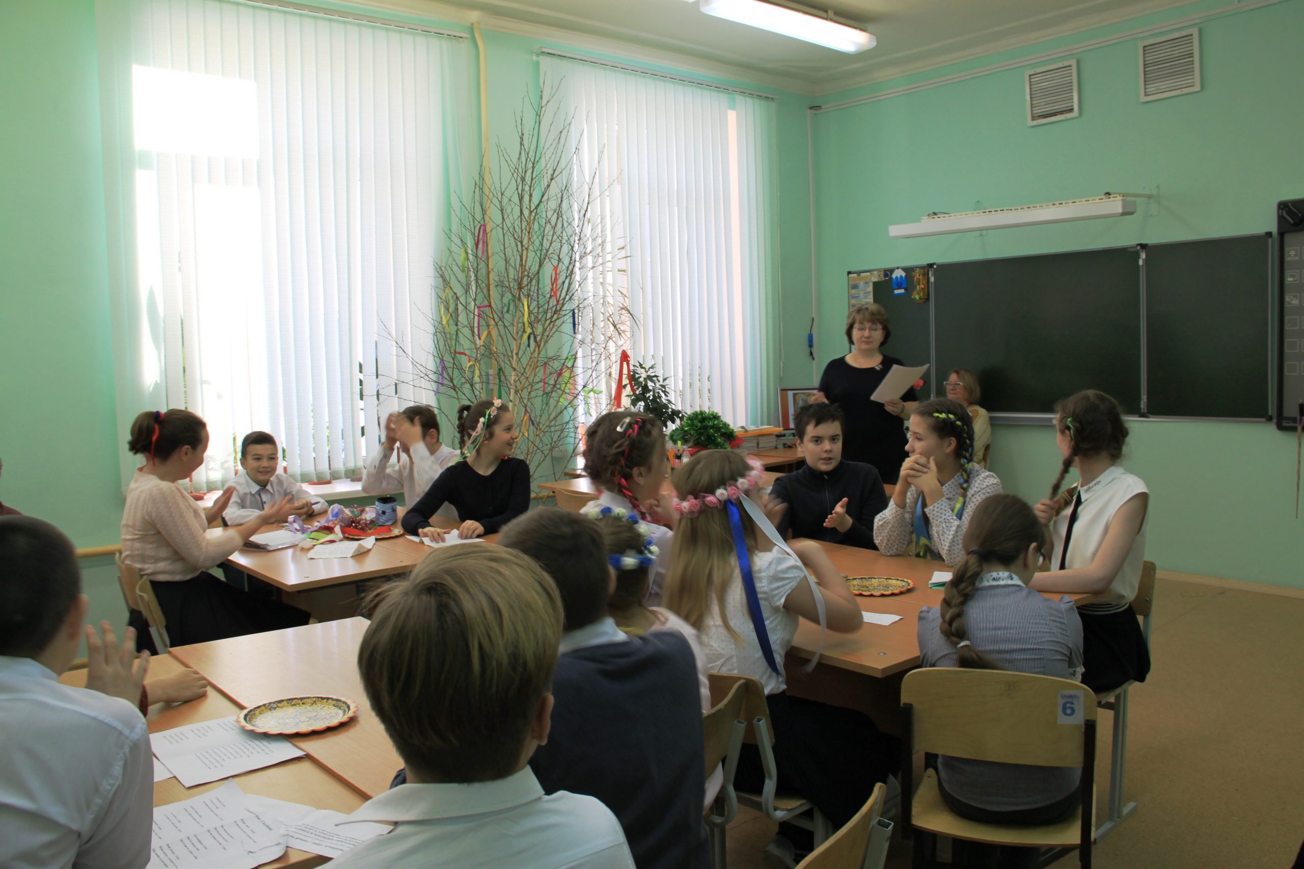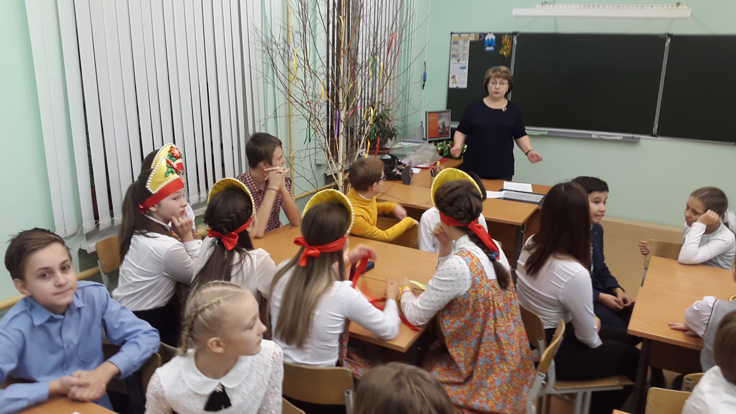 Лишь только зайдя в помещение, обратила внимание, что класс дышит сказочной атмосферой. Около столов стояла живая (!!!) берёза, украшенная ленточками. Многие дети были в народных костюмах, кокошниках или венках с лентами.