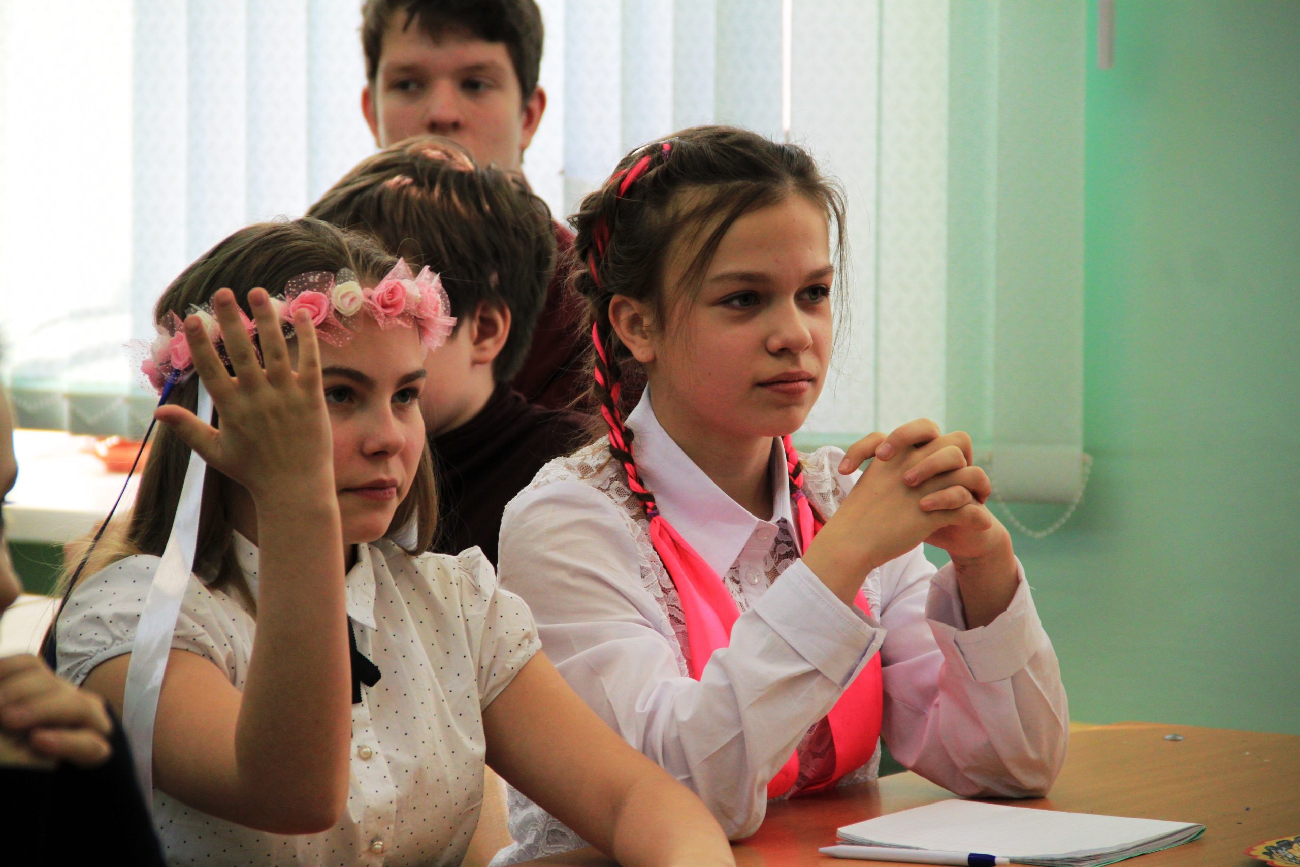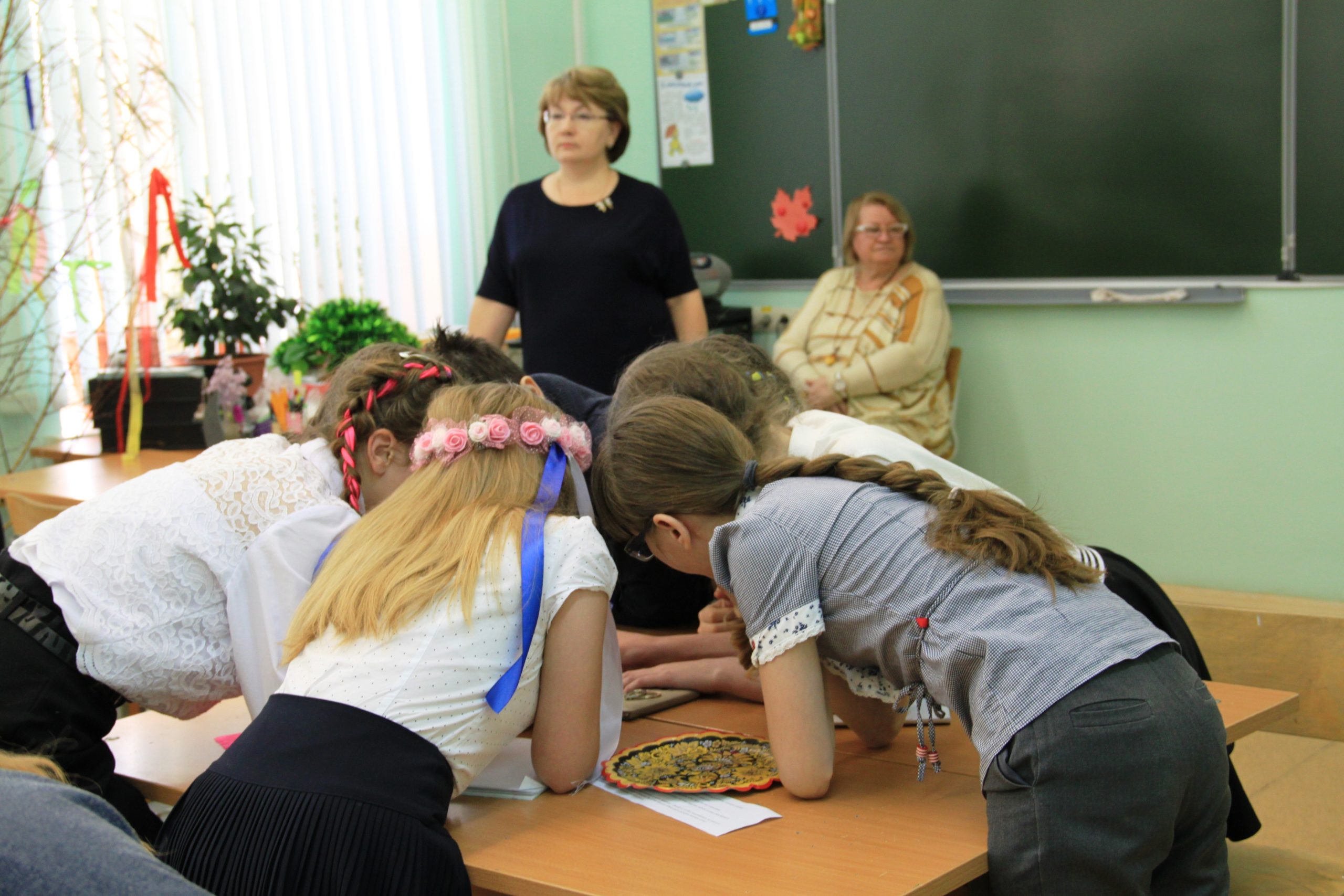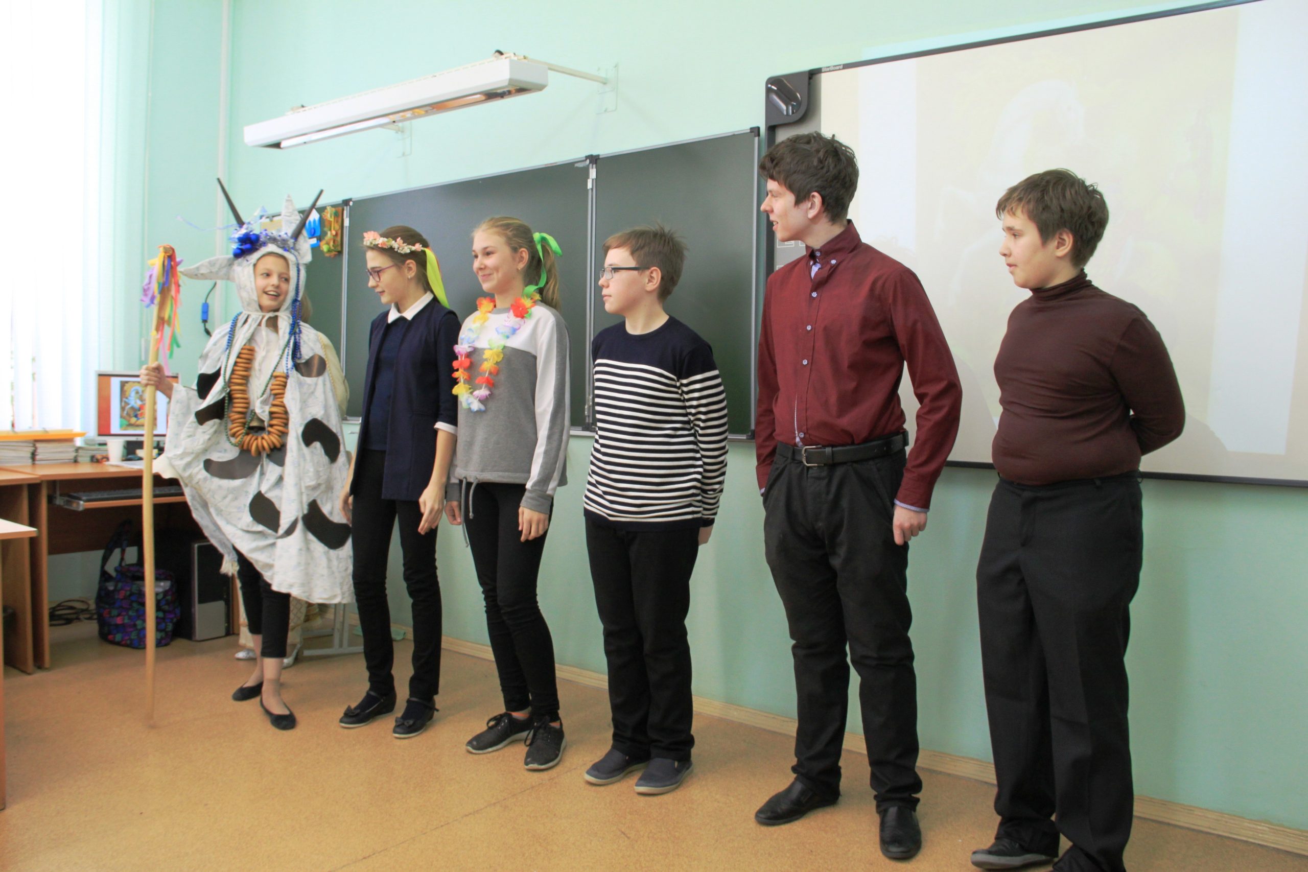 Лишь только зайдя в помещение, обратила внимание, что класс дышит сказочной атмосферой. Около столов стояла живая (!!!) берёза, украшенная ленточками. Многие дети были в народных костюмах, кокошниках или венках с лентами.