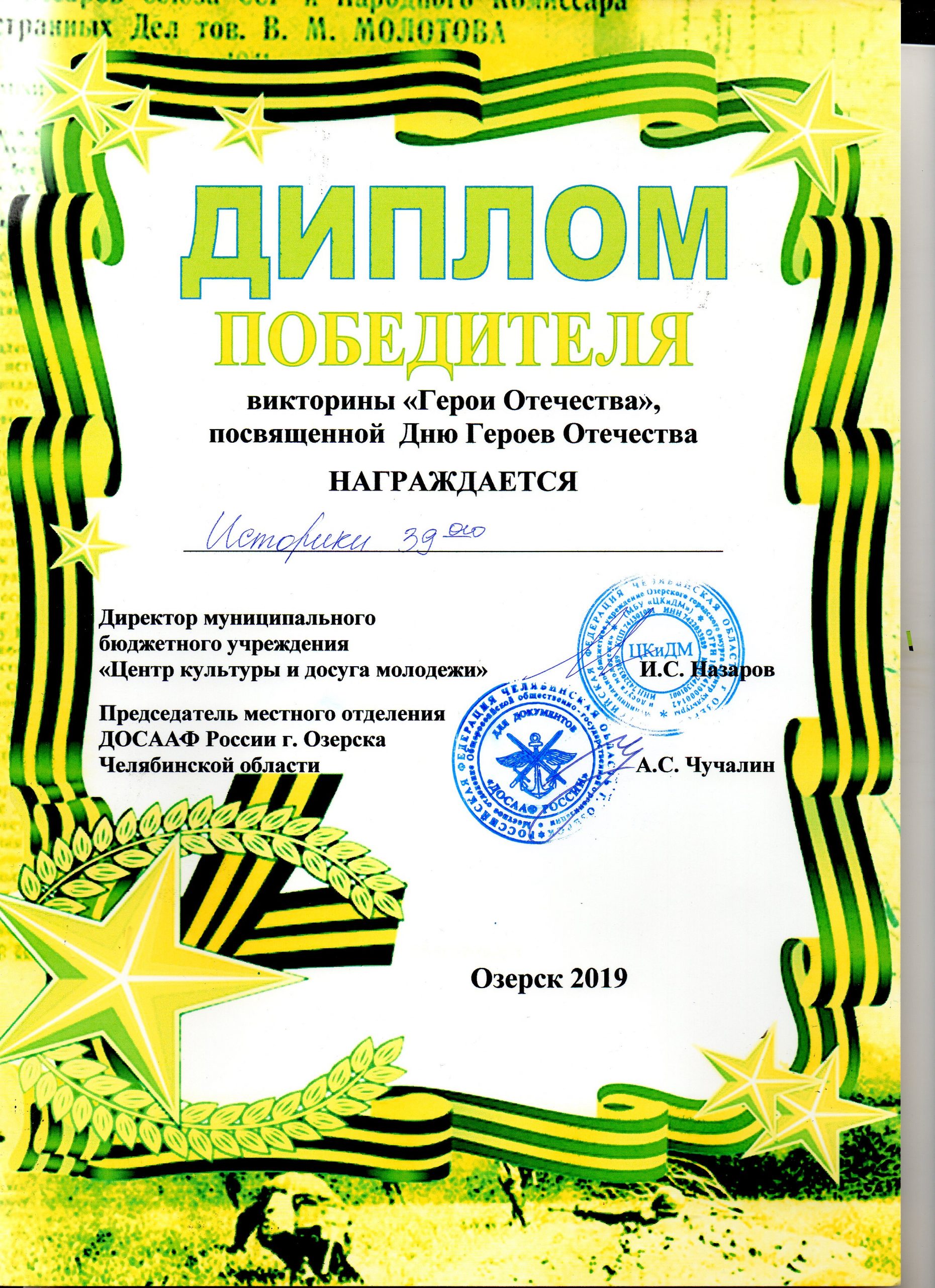Ученики 9а класса с классным руководителем М.А. Домбровской посетили Городской музей, где состоялось открытие выставки о гражданской войне на Урале из фондов областного музея. А лицеисты 9б класса с классным руководителем С.В.Кузнецовым заняли первое место в викторине «Герои Отечества», подготовленной МБУ «Центр досуга и культуры молодежи».