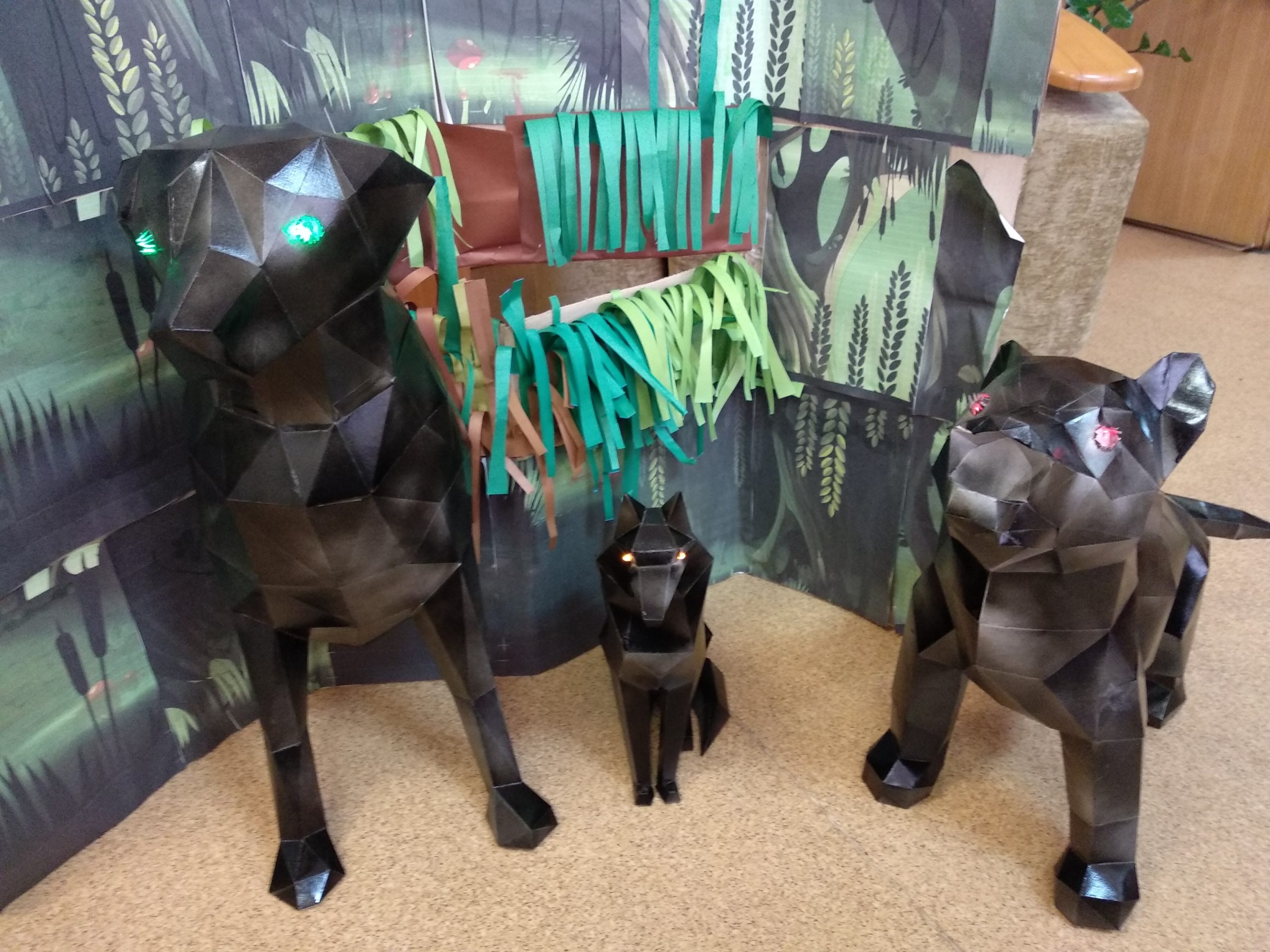 Совместными усилиями учителей, детей и вожатых были сконструированы модели собак Баскервилей в технике паперкрафт. С помощью учителей физики удалось сделать собакам устрашающие светящиеся глаза.