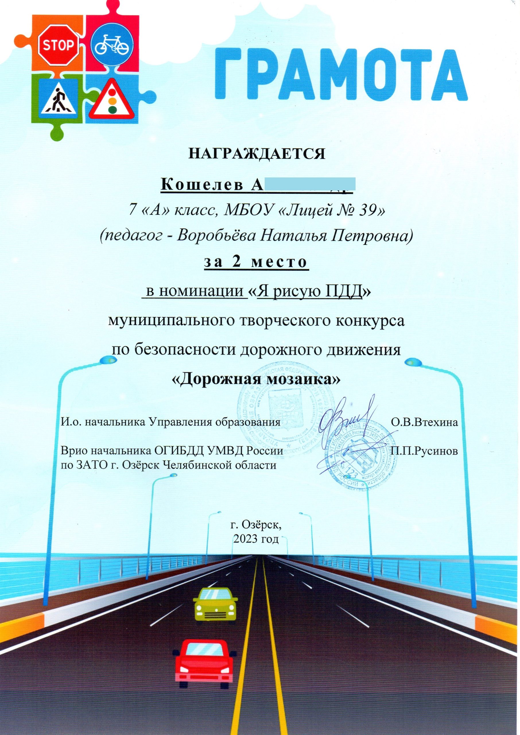 обучающегося  7 класса Кошелева А. победителя (II место) муниципального  творческого конкурса по безопасности дорожного движения «Дорожная мозаика»