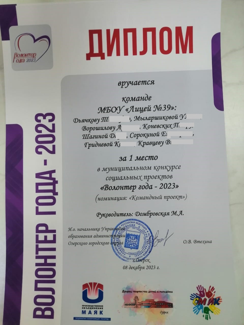 Команду МБОУ «Лицей №39» за победу в муниципальном конкурсе социальных проектов «Волонтер года — 2023» (номинация «Командный проект»).