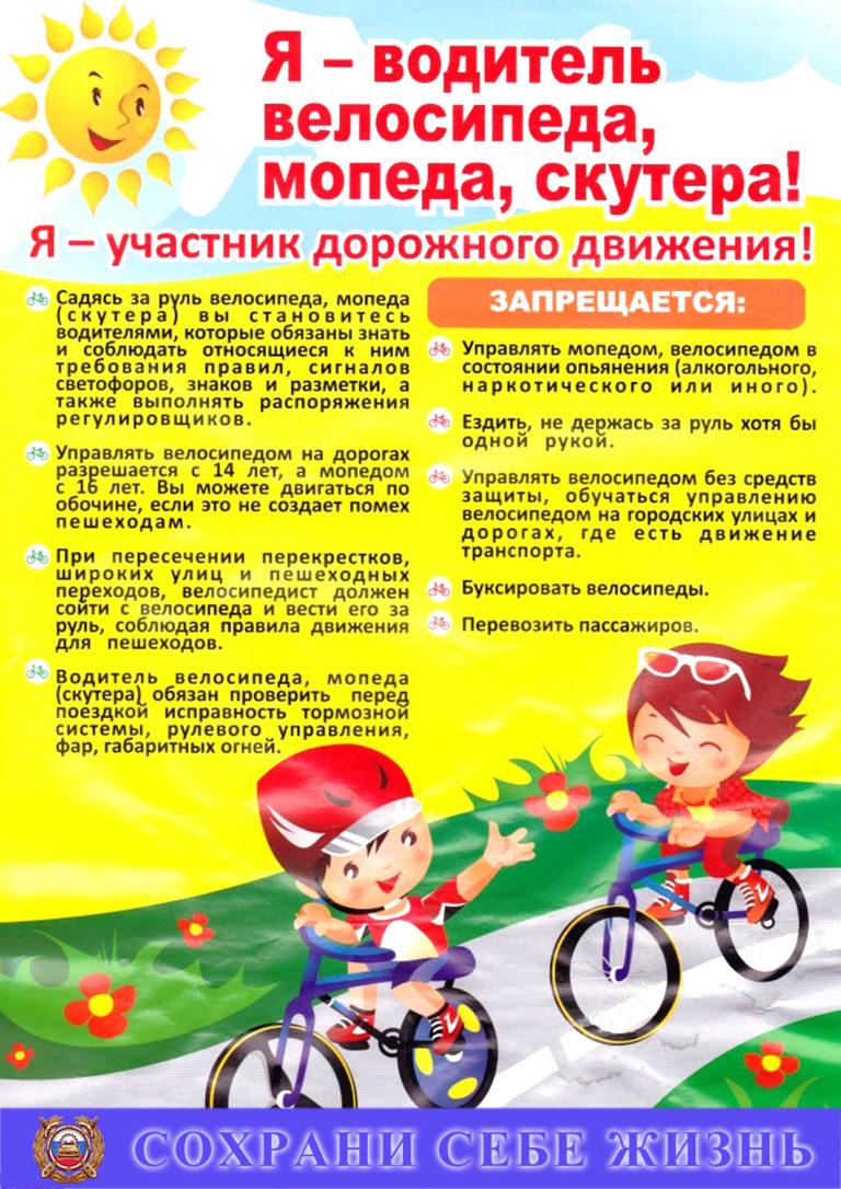 - Помните! Управлять велосипедом при движении на дорогах разрешается лицам не моложе 14 лет, а мопедом — не моложе 16 лет. Разъясняйте эти правила своим детям.