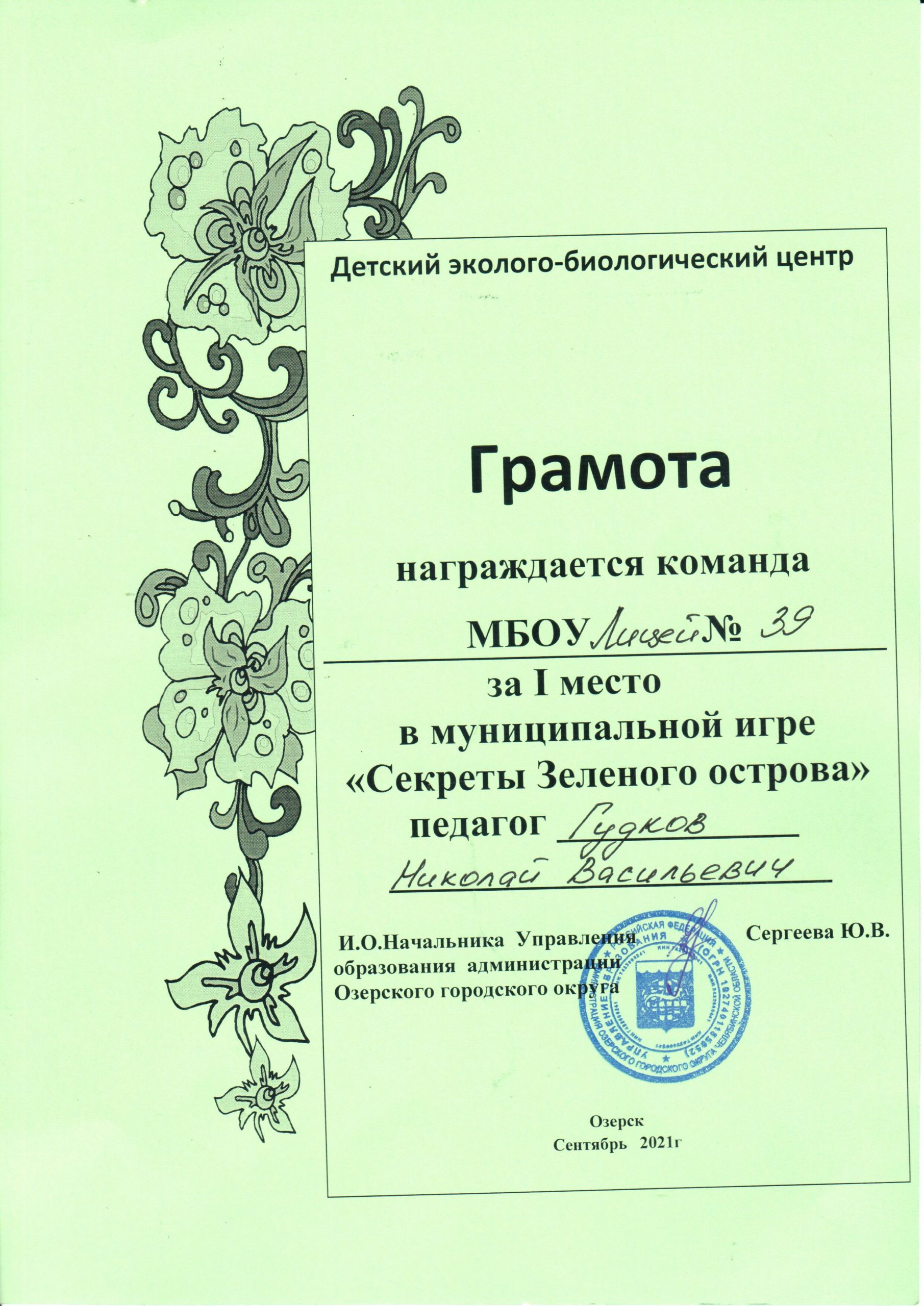 Команду 6-х классов МБОУ «Лицей №39» за I место в муниципальной игре «Секреты Зеленого острова».